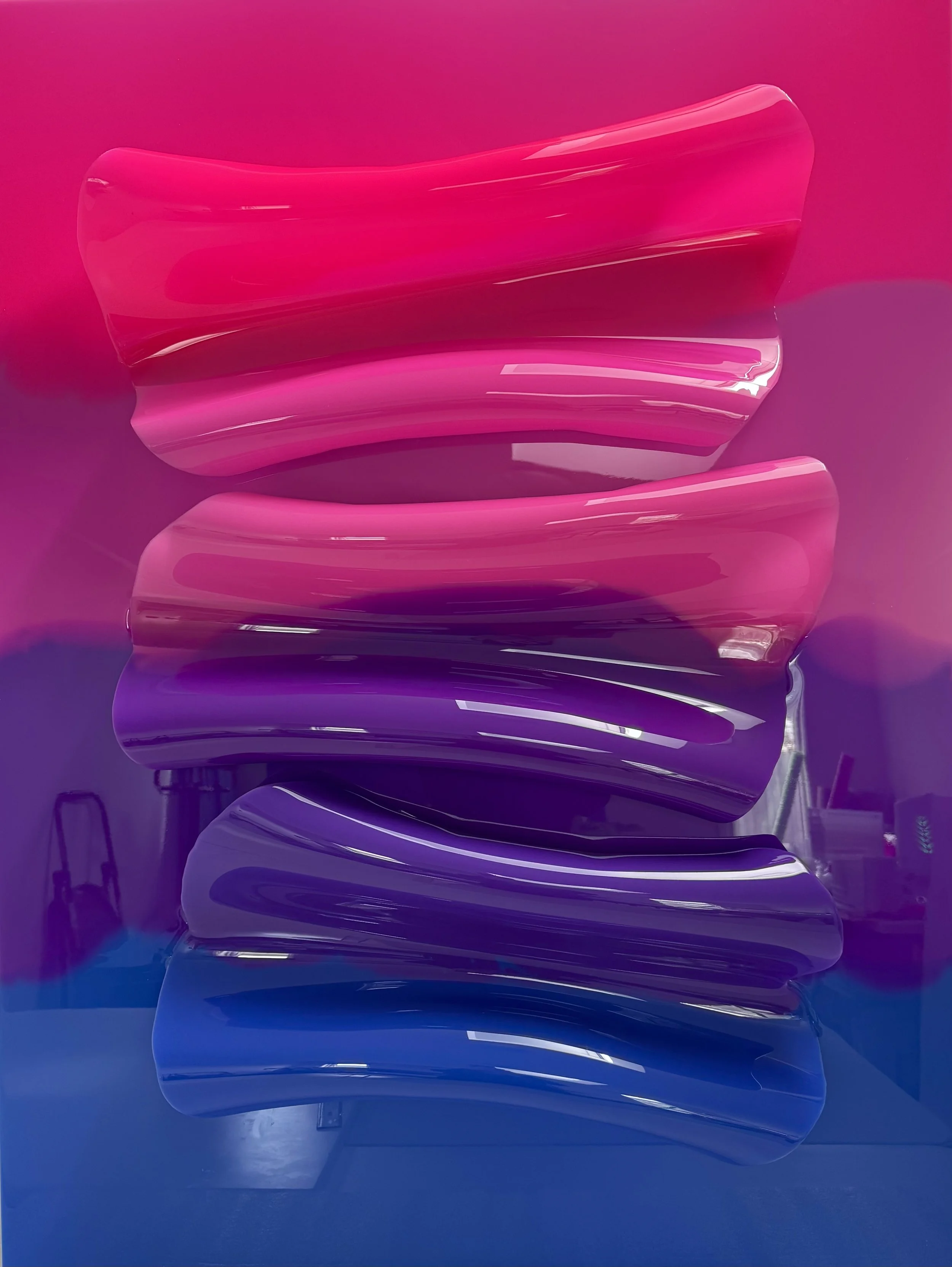 Her recent series incorporates fluoro and metallic pigments that intensify these optical effects, producing fields of colour that glow, fracture, or dissolve depending on the angle of view. The resulting works oscillate between the organic and the digital, between the language of modernist abstraction and the aesthetics of technological display.